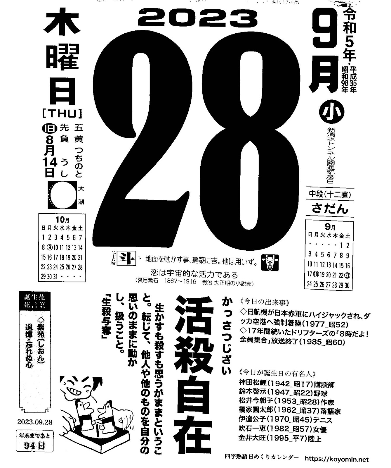 原えつお四文字ひめくりカレンダー「令和5年9月28日(木)先負 二十八宿:斗」「活殺自在」旧歴8月14日